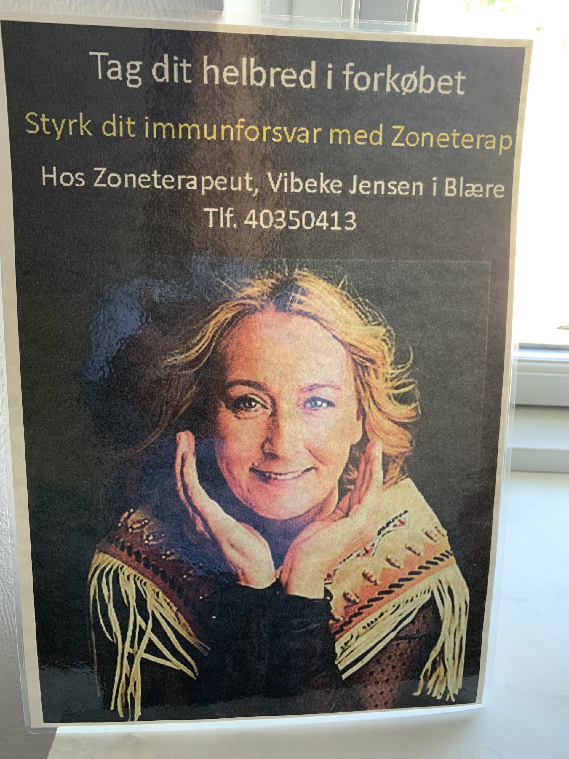 Zoneterapien foregår på fødderne. Samtidig udfører mine hænder Healing, som mange fornemmer ret kraftfuldt. Undervejs samtaler jeg i behandlingen og bruger mine clairvoyante evne. Alt i alt, et dejligt boost til hele kroppen. Har en masse viden om Homøopatisk medicin og Bachs blomstermedicin. Samt kost, vitaminer og mineraler. Har undervist i motions gymnastik også i 23 år.